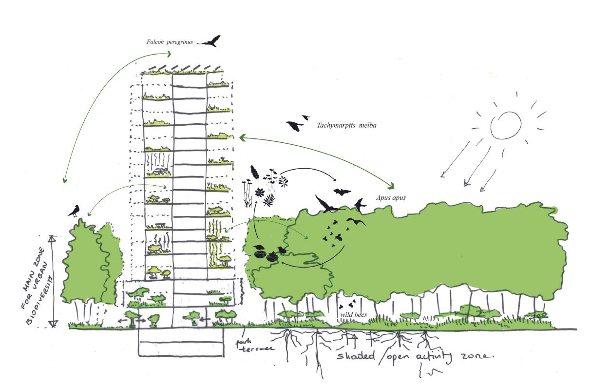 Besonders beeindruckend ist die Verzahnung von Park und Hochhaus. Der Park «fliesst» förmlich durch das Erdgeschoss und hinaus auf die andere Seite, wodurch Innen- und Aussenraum miteinander verschmelzen. Grosse Fensterfronten und offene Strukturen schaffen eine Verbindung zwischen Natur und Architektur.